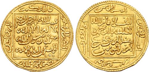 Islamic Auction 9 Lot: 153. Almohads (al-Muwahhidun). Abu Yusuf Ya‘qub. AH 580-595 / AD 1184-1199. AV Dinar (28.2mm, 4.61 g, 12h). Without mint-name. Undated. EF.