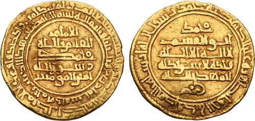 Islamic Auction 9 Lot: 178. Fatimids. al-Qa’im bi-Amr Allah. AH 322-334 / AD 934-946. AV Dinar (18mm, 4.21 g, 5h). Posthumous issue. Al-Qayrawan mint. Dated AH 335 (AD 946/7). Near VF.