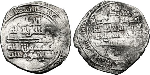 Islamic Auction 9 Lot: 159. Tulunids. Khumarawayh b. Ahmad. AH 270-282 / AD 884-896. AR Donative Dirham (16.5mm, 2.77 g, 5h). Struck on a small thick flan. Misr mint. Dated AH 276 (AD 889/90). VF.