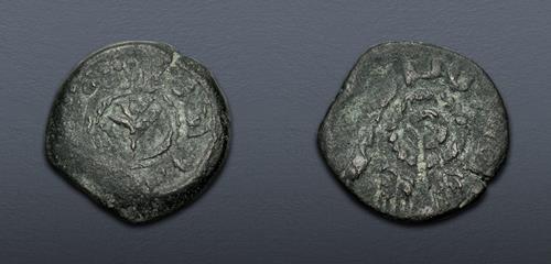 CNG Feature Auction 129 Lot: 631. Umayyad Caliphate, Bronze coinage. Æ Fals (18mm, 2.47 g, 12h). Pictorial type (Palm tree/pellet-in-annulet). Overstruck on a prutah of Agrippa I. al-Ramla mint. Struck circa AH 120s. Near VF.