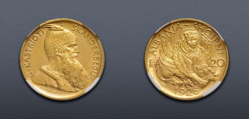 CNG Feature Auction 129 Lot: 636. ALBANIA, Republic of Albania. Amet Zogu. President, 1925-1928. AV 20 Franga Ari (21mm, 6.45 g, 6h). Rome mint. Dated 1926 R. NGC MS 64.
