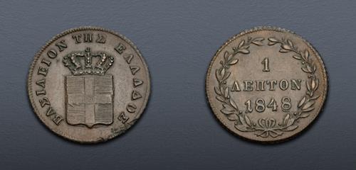 CNG Feature Auction 129 Lot: 727. GREECE, Kingdom. Othon. 1833-1862. CU Lepton (17mm, 1.28 g, 6h). Athens mint. Dated 1848 (the second 8 doubled). NGC AU 55 BN.