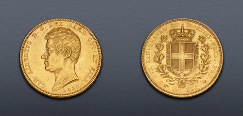 CNG Feature Auction 129 Lot: 764. ITALY, Sardegna (Kingdom). Carlo Alberto. 1831-1849. AV 100 Lire (35mm, 32.18 g, 6h). Torino (Turin) mint; segni: eagle’s head. Dated 1835 P. AU.