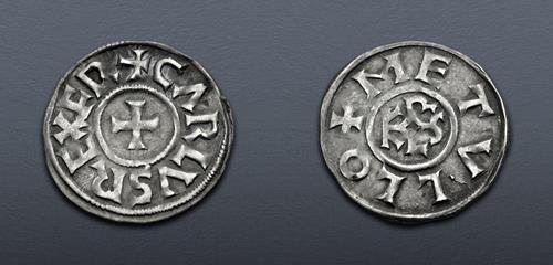 Electronic Auction 586 Lot: 770. CAROLINGIANS. Charles le Chauve (the Bald). As Charles II, King of West Francia, 840-877. AR Denier (21mm, 1.53 g, 6h). Metullo (Melle) mint. VF.
