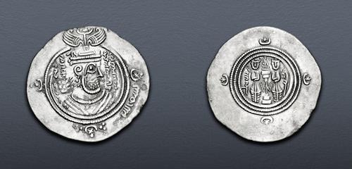 Electronic Auction 586 Lot: 788. Pre-reform issues, Arab-Sasanian. Mu'awiya I b. Abi Sufyan. Umayyad caliph, AH 41-60 / AD 661-680. AR Drachm (32mm, 3.77 g, 3h). DA (Darabjird) mint. Dated AH 43 (immobilized date, struck circa AH 54-55 [AD 675]). VF.