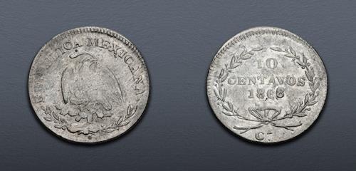 Electronic Auction 586 Lot: 1009. MEXICO, Second Republic. 1867-1905. AR 10 Centavos (18mm, 2.92 g, 10h). Chihuahua mint. Dated 1868/8 Ca. EF.