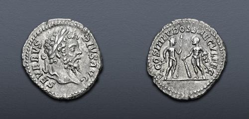 Electronic Auction 587 Lot: 802. Septimius Severus, with Caracalla and Geta as Caesar. AD 193-211. AR Denarius (18mm, 2.78 g, 8h). Dynastic issue. Rome mint. Struck AD 201-202. Near EF.