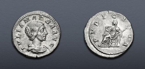 Electronic Auction 587 Lot: 833. Julia Maesa. Augusta, AD 218-224/5. AR Denarius (19mm, 3.03 g, 6h). Rome mint. Struck under Elagabalus, AD 218-220. Near EF.