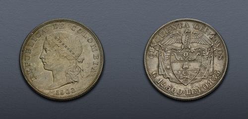 Electronic Auction 588 Lot: 792. COLOMBIA, Republic of Colombia. 1886-present. AR 50 Centavos (29mm, 12.48 g, 6h). Philadelphia mint. Dated 1902. AU.