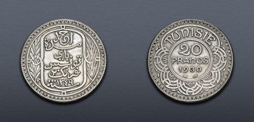 Electronic Auction 588 Lot: 888. TUNISIA, Husaynid Beys. Ahmad II. AH 1347-1361 / AD 1929-1942. AR 20 Francs (35mm, 19.88 g, 6h). Paris mint; différents: cornucopia and torch. Dated AH 1349 and AD 1930. EF.