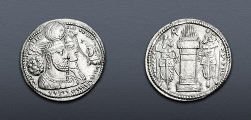 Electronic Auction 589 Lot: 334. SASANIAN KINGS. Vahrām (Bahram) II, with Queen and Prince 4. AD 276-293. AR Drachm (29.5mm, 4.45 g, 3h). Style A. 'Ctesiphon' mint. Near EF.
