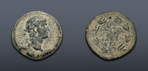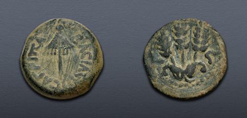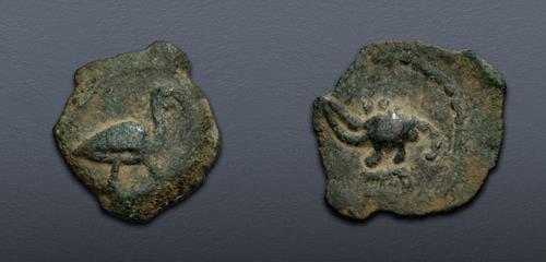Electronic Auction 589 Lot: 432. JUDAEA, Caesarea Maritima. 1st-2nd centuries CE. Æ “Minim” (13mm, 0.86 g, 4h). Copying a dichalkon of Augustus from Alexandria, Egypt. Near VF.
