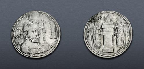 Electronic Auction 590 Lot: 334. SASANIAN KINGS. Vahrām (Bahram) II, with Queen and Prince 4. AD 276-293. AR Drachm (28mm, 4.35 g, 3h). Style A. 'Ctesiphon' mint. Near EF.