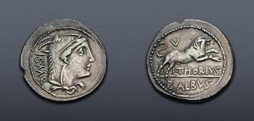 Electronic Auction 590 Lot: 596. L. Thorius Balbus. 105 BC. AR Denarius (21mm, 3.75 g, 4h). Rome mint. VF.