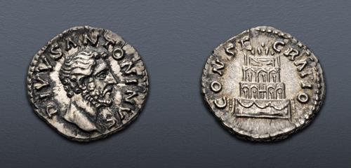 Electronic Auction 524 Lot: 530. Divus Antoninus Pius. Died AD 161. AR Denarois (17mm, 3.44 g, 8h). Consecration issue. Rome mint. Struck under Marcus Aurelius and Lucius Verus, AD 161. Good VF.