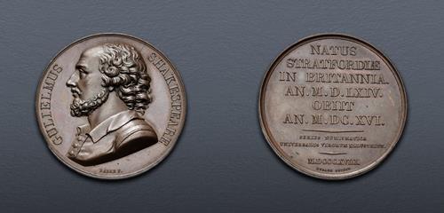 Electronic Auction 524 Lot: 960. TUDOR. William Shakespeare, playwright and poet. 1564-1616. Æ Medal (40mm, 36.98 g, 12h). By Barre. Durand, editor. Dated 1564, 1616, and 1818. Good VF.
